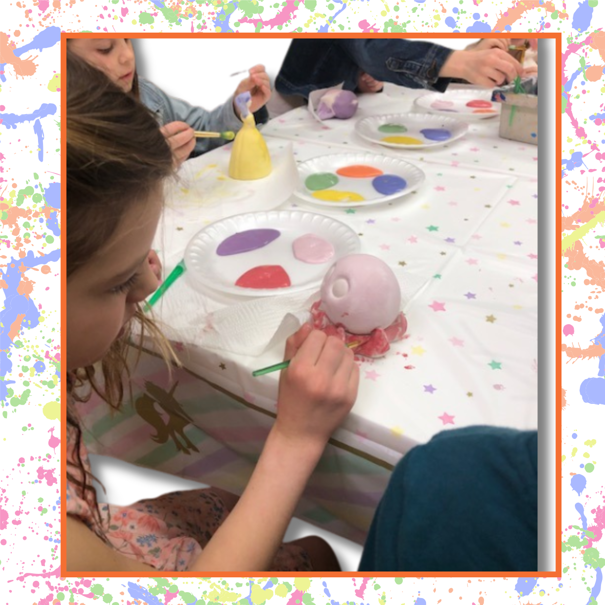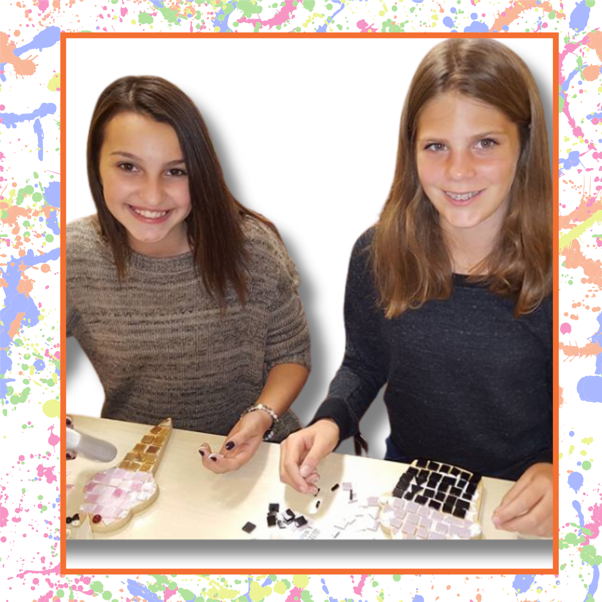 Our mosaics are loads of fun! The kids choose a mosaic shape of their choice to paint and decorate with various colored, textured, and shaped tiles. Pieces are available to take home the same day.