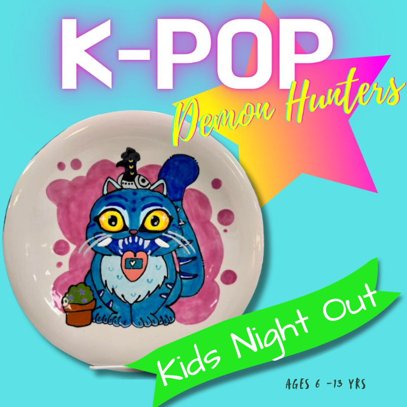 Hey Kids! Come make a derpy cat plate or another KDH inspired pottery project with the bees! We will listen to all your favorite Saja Boys and HUNTR/X songs and have a great time creating! This kids-only paint night is on Friday, April 3rd. If we finish crafting early, we’ll play games and have tons of fun!