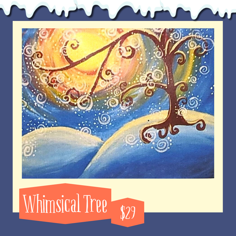 Join us at the studio for an evening of creativity, while the Bees instruct you step by step through our whimsical winter tree canvas! Your $29 class fee covers your […]